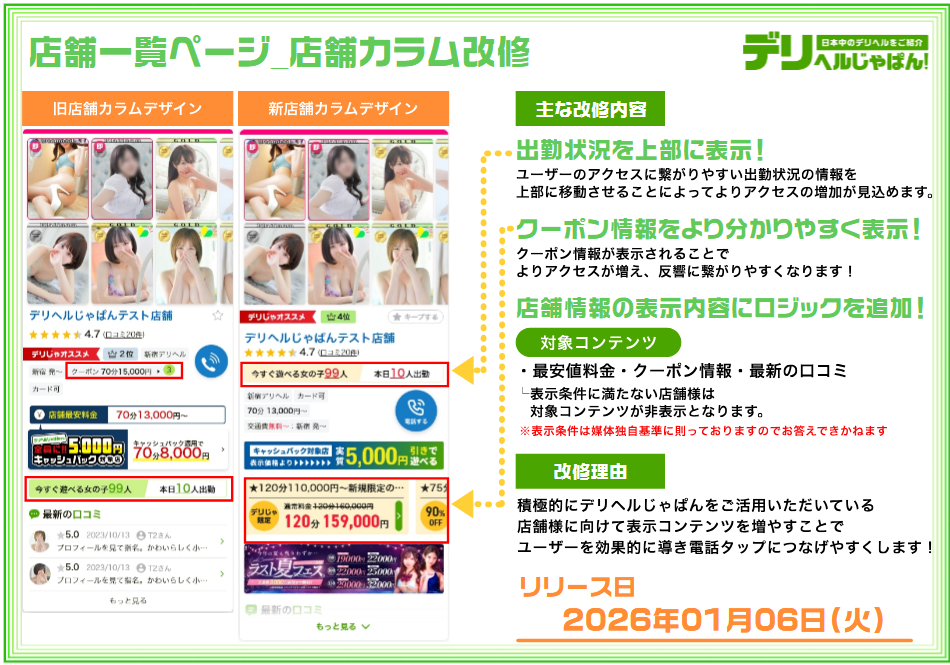 デリヘルじゃぱんより、店舗一覧ページ・店舗カラム改修についてのお知らせ致します。